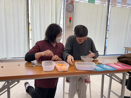 2年目になり、新年会の福笑い・夏祭り・ミニ運動会・かるた取りなどチーム合戦をすると、仲間で譲り合う行動や言動も生まれてます。大玉転がしでは全員で(スタッフも熱くなり)記録を更新してます。